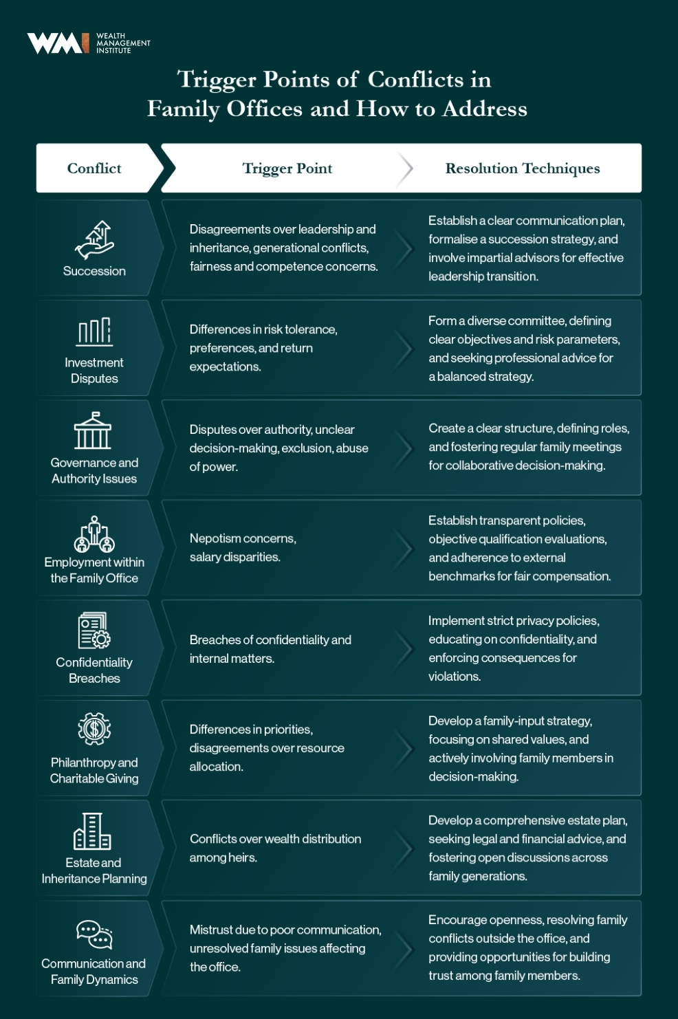 Here are some potential areas and trigger points of conflicts in family offices, along with key issues and strategies to address them: